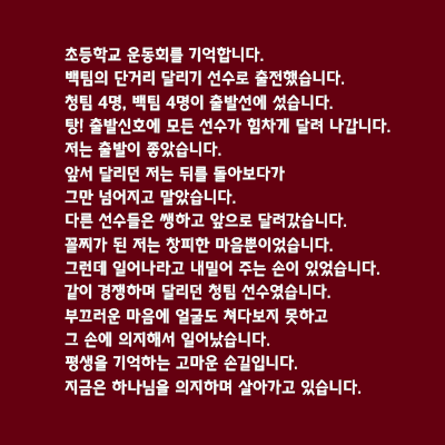 "초등학교 운동회를 기억합니다. 백팀의 단거리 달리기 선수로 출전했습니다. 청팀 4명, 백팀 4명이 출발선에 섰습니다.  탕! 출발신호에 모든 선수가 힘차게 달려 나갑니다.  저는 출발이 좋았습니다. 앞서 달리던 저는 뒤를 돌아보다가  그만 넘어지고 말았습니다. 다른 선수들은 쌩하고 앞으로 달려갔습니다. 꼴찌가 된 저는 창피한 마음뿐이었습니다. 그런데 일어나라고 내밀어 주는 손이 있었습니다. 같이 경쟁하며 달리던 청팀 선수였습니다. 부끄러운 마음에 얼굴도 쳐다보지 못하고  그 손에 의지해서 일어났습니다. 평생을 기억하는 고마운 손길입니다. 지금은 하나님을 의지하며 살아가고 있습니다."