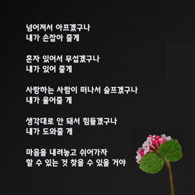 "넘어져서 아프겠구나 내가 손잡아 줄게 혼자 있어서 무섭겠구나 내가 있어 줄게 사랑하는 사람이 떠나서 슬프겠구나 내가 울어줄 게 생각대로 안 돼서 힘들겠구나 내가 도와줄 게 마음을 내려놓고 쉬어가자 할 수 있는 것 찾을 수 있을 거야."