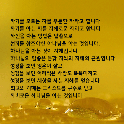 "자기를 모르는 자를 우둔한 자라고 합니다 자기를 아는 자를 지혜로운 자라고 합니다 자신을 아는 방법은 말씀으로  천지를 창조하신 하나님을 아는 것입니다. 하나님을 아는 것이 지혜입니다 하나님의 말씀은 온갖 지식과 지혜의 근원입니다 성경을 보면 영혼이 살고  성경을 보면 어리석은 사람도 똑똑해지고  성경을 보면 세상을 사는 지혜를 얻습니다  최고의 지혜는 그리스도를 구주로 믿고  자비로운 하나님을 아는 것입니다."