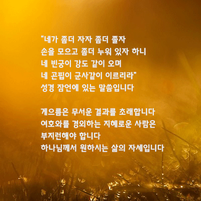 “네가 좀더 자자 좀더 졸자 손을 모으고 좀더 누워 있자 하니 네 빈궁이 강도 같이 오며 네 곤핍이 군사같이 이르리라” 성경 잠언에 있는 말씀입니다 게으름은 무서운 결과를 초래합니다 여호와를 경외하는 지혜로운 사람은 부지런해야 합니다 하나님께서 원하시는 삶의 자세입니다."