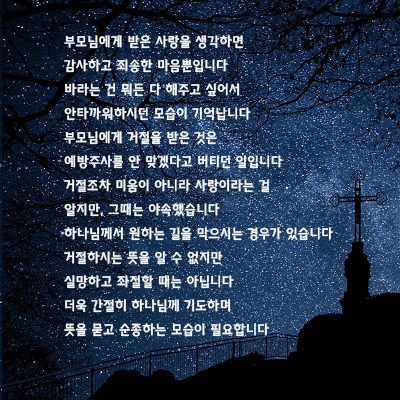 "부모님에게 받은 사랑을 생각하면 감사하고 죄송한 마음뿐입니다 바라는 건 뭐든 다 해주고 싶어서 안타까워하시던 모습이 기억납니다 부모님에게 거절을 받은 것은 예방주사를 안 맞겠다고 버티던 일입니다 거절조차 미움이 아니라 사랑이라는 걸 알지만, 그때는 야속했습니다 하나님께서 원하는 길을 막으시는 경우가 있습니다 거절하시는 뜻을 알 수 없지만 실망하고 좌절할 때는 아닙니다 더욱 간절히 하나님께 기도하며 뜻을 묻고 순종하는 모습이 필요합니다."