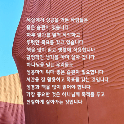 "세상에서 성공을 거둔 사람들은 좋은 습관이 있습니다 하루 일과를 일찍 시작하고 뚜렷한 목표를 갖고 있습니다 책을 많이 읽고 생활에 적용합니다 긍정적인 생각을 하며 살아 갑니다 하나님을 믿는 우리들도 성공하기 위해 좋은 습관이 필요합니다 시간을 잘 활용하고 목표를 갖는 것입니다 성경과 책을 많이 읽어야 합니다 가장 중요한 것은 하나님께 목적을 두고 진실하게 살아가는 것입니다."