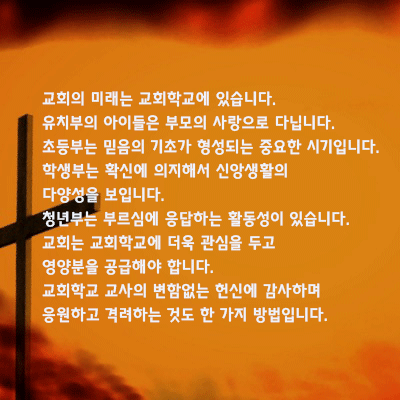 "교회의 미래는 교회학교에 있습니다. 유치부의 아이들은 부모의 사랑으로 다닙니다. 초등부는 믿음의 기초가 형성되는 중요한 시기입니다. 학생부는 확신에 의지해서 신앙생활의 다양성을 보입니다. 청년부는 부르심에 응답하는 활동성이 있습니다. 교회는 교회학교에 더욱 관심을 두고 영양분을 공급해야 합니다. 교회학교 교사의 변함없는 헌신에 감사하며 응원하고 격려하는 것도 한 가지 방법입니다."