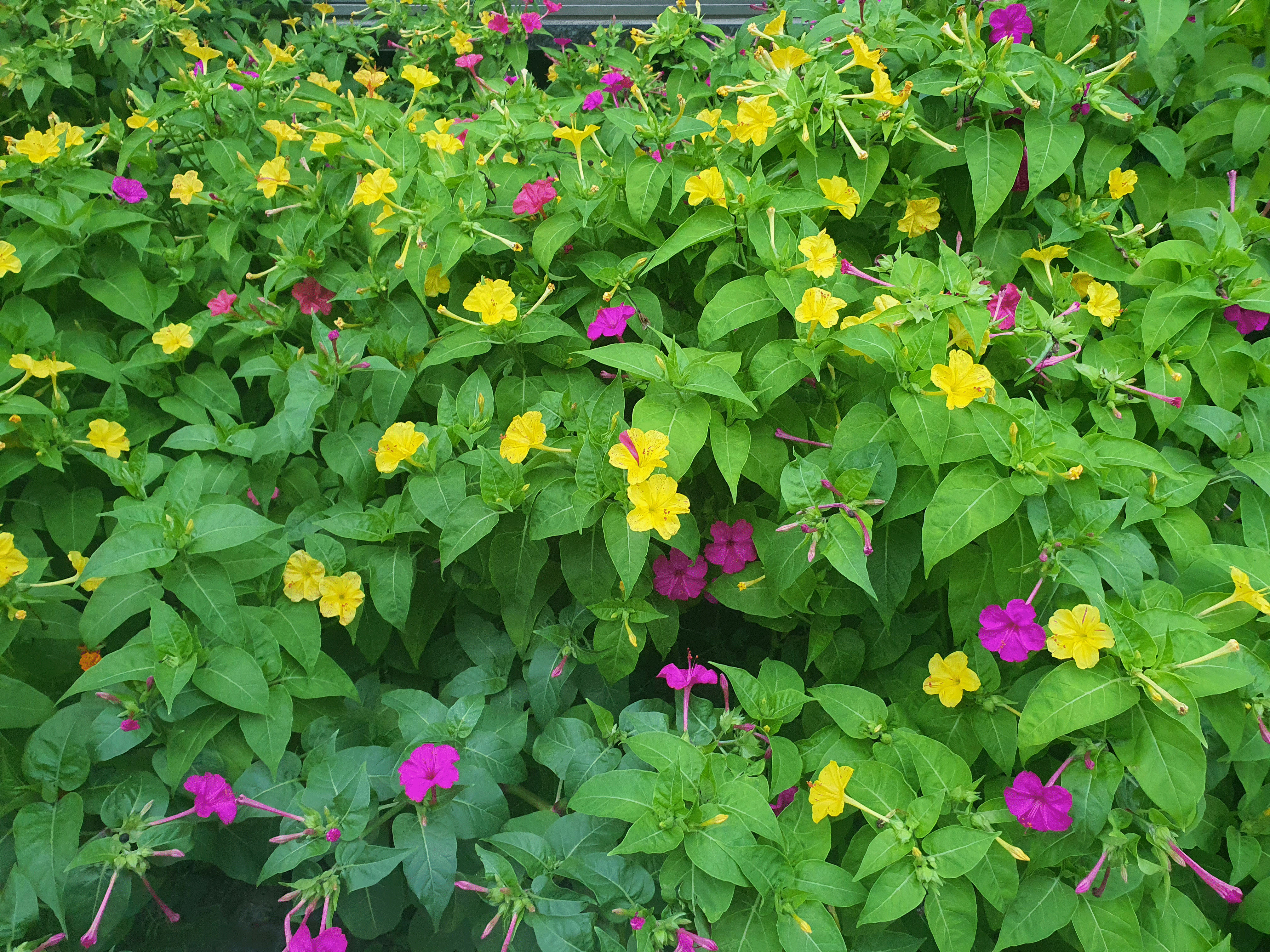 "교회 화단에 분꽃이 피었습니다. 만날 때마다 웃는 얼굴로 인사합니다. 가느다란 비바람에 흔들리는 모습이 싱그럽고 빗방울 머금은 꽃잎은 보석 같은 왕관입니다. 빨간 꽃은 노래하고 노란 꽃은 춤을 추며 서로 보듬은 모습이 아름답습니다. 분꽃의 꽃말은 수줍음과 소심 그리고 겁쟁이입니다. 내일은 내가 먼저 인사하겠습니다."