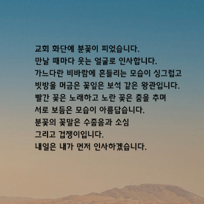 "교회 화단에 분꽃이 피었습니다. 만날 때마다 웃는 얼굴로 인사합니다. 가느다란 비바람에 흔들리는 모습이 싱그럽고 빗방울 머금은 꽃잎은 보석 같은 왕관입니다. 빨간 꽃은 노래하고 노란 꽃은 춤을 추며 서로 보듬은 모습이 아름답습니다. 분꽃의 꽃말은 수줍음과 소심 그리고 겁쟁이입니다. 내일은 내가 먼저 인사하겠습니다."