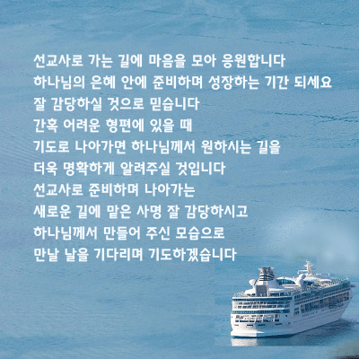 "선교사로 가는 길에 마음을 모아 응원합니다 하나님의 은혜 안에 준비하며 성장하는 기간 되세요 잘 감당하실 것으로 믿습니다 간혹 어려운 형편에 있을 때 기도로 나아가면 하나님께서 원하시는 길을 더욱 명확하게 알려주실 것입니다 선교사로 준비하며 나아가는 새로운 길에 맡은 사명 잘 감당하시고 하나님께서 만들어 주신 모습으로 만날 날을 기다리며 기도하겠습니다."